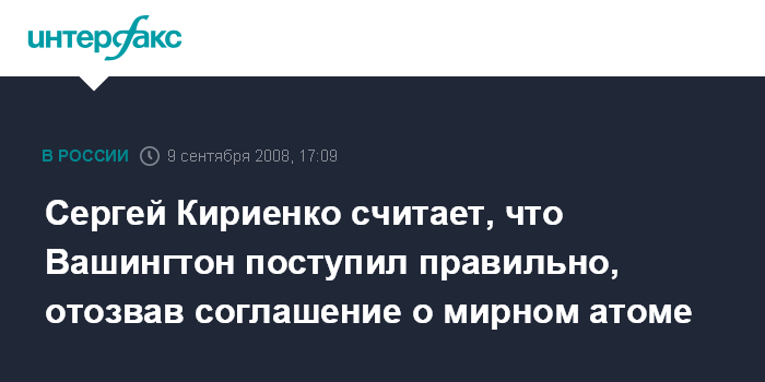 Ереван. 9 сентября. INTERFAX.RU - Глава госкорпорации "Росатом" Сергей Кириенко считает, что администрация США поступила правильно, отозвав из Конгресса соглашение с Россией о сотрудничестве в сфере мирного атома, поскольку в предвыборный период возможность его ратификации была маловероятна.