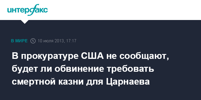 Вашингтон. 10 июля. INTERFAX.RU - В прокуратуре США пока не сообщают, собираются ли они добиваться вынесения смертного приговора Джохару Царнаеву, обвиняемому в проведении теракта в Бостоне, пишет в среду американская газета Boston Herald.