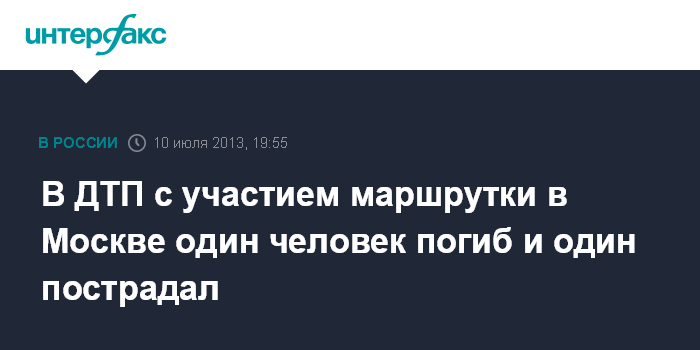 Москва. 10 июля. INTERFAX.RU - Один человек погиб и еще один получил травмы в среду в результате столкновения маршрутного такси и легковой автомашины на северо-востоке Москвы, сообщил "Интерфаксу" источник в правоохранительных органах.