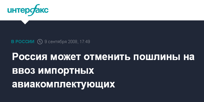 Ульяновск. 9 сентября. INTERFAX.RU - Премьер-министр РФ Владимир Путин не исключает возможности при определенных условиях отмены пошлин на ввоз импортных комплектующих для самолетов.