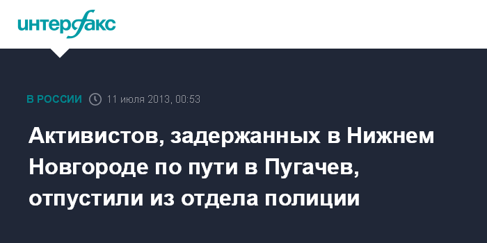 Нижний Новгород. 11 июля. INTERFAX.RU - Активисты, ехавшие в город Пугачев (Саратовская область) и задержанные в среду в Нижнем Новгороде, были отпущены на свободу без составления протокола, сообщается на сайте незарегистрированной партии "Другая Россия".