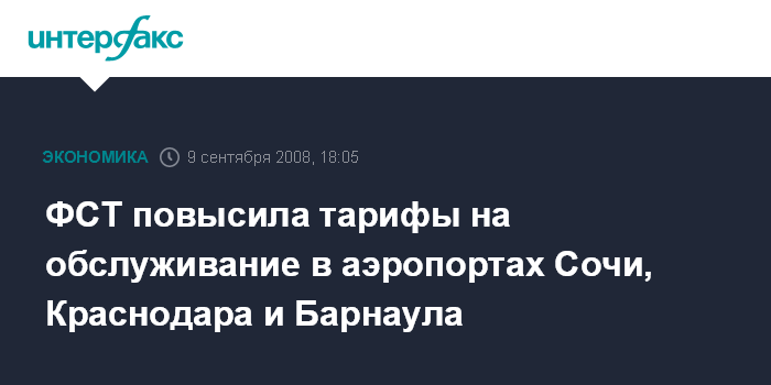 Москва. 9 сентября. INTERFAX.RU - Правление Федеральной службы по тарифам РФ на заседании во вторник приняло решение о повышении сборов за обслуживание самолетов в аэропортах Сочи, Краснодара и Барнаула, говорится в сообщении пресс-службы ФСТ.