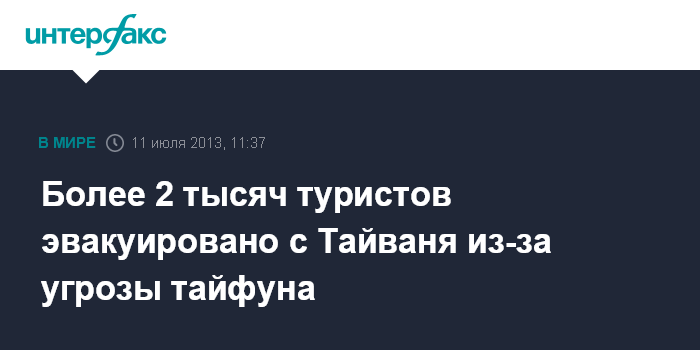 Пекин. 11 июля. INTERFAX.RU - Власти Тайваня распорядились эвакуировать 2,3 тыс. туристов в связи с приближением мощного тайфуна "Соулик".
