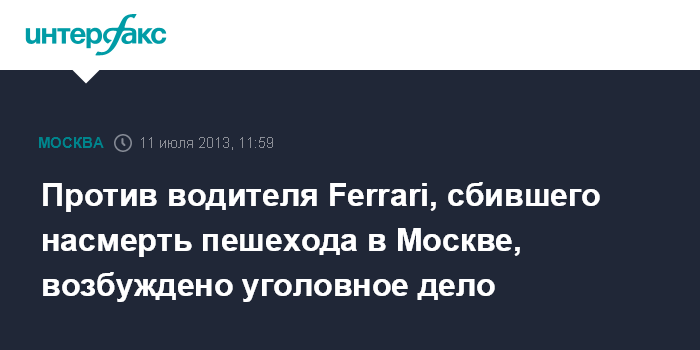 Москва. 11 июля. INTERFAX.RU - Уголовное дело возбуждено в отношении водителя Ferrari, минувшей ночью сбившего насмерть мужчину на Минской улице в столице. Ему грозит до пяти лет лишения свободы, сообщили "Интерфаксу" в пресс-службе ГУ МВД России по Москве в четверг.