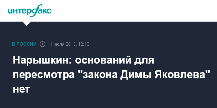 Москва. 11 июля. INTERFAX.RU - Спикер Госдумы РФ Сергей Нарышкин заявил на пресс-конференции в Москве в четверг, что нет оснований пересматривать "закон Димы Яковлева", запрещающий усыновление российских сирот американцам.