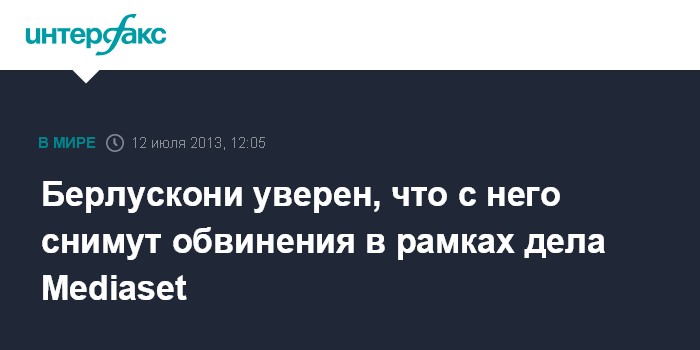 Рим. 12 июля. INTERFAX.RU - Бывший премьер-министр Италии Сильвио Берлускони не сомневается в том, что Верховный кассационный суд страны снимет с него все обвинения по так называемому делу Mediaset, сообщает в пятницу газета Corriere della Sera.