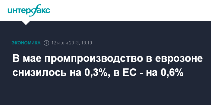 12 июля. FINMARKET.RU - Объем промышленного производства в еврозоне в мае 2013 года снизился на 0,3% по сравнению с предыдущим месяцем, когда его рост составлял 0,5%, свидетельствуют данные Статистического управления Европейского союза (Eurostat).