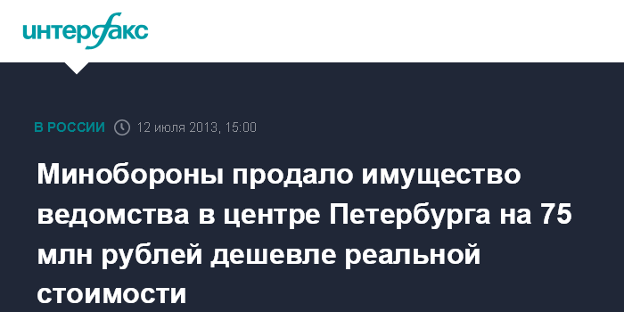 Москва. 12 июля. INTERFAX.RU - Бывшие руководители Департамента имущественных отношений Минобороны России уличены в продаже по заниженной цене имущества военного ведомства в центре Санкт-Петербурга.
