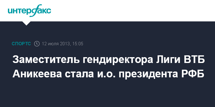 Москва. 12 июля. INTERFAX.RU - Исполком Российской федерации баскетбола избрал Юлию Аникееву на пост и.о. президента РФБ. Члены исполкома рассмотрели заявление Леонида Европейцева, который по состоянию здоровья не может исполнять обязанности президента РФБ. Большинством голосов исполняющей обязанности Президента РФБ до даты проведения отчетно-выборной конференции РФБ (2 августа 2013 года) была избрана Аникеева.