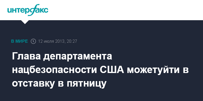 Вашингтон. 12 июля. INTERFAX.RU - Глава департамента национальной безопасности США Джанет Наполитано, по некоторым данным, намерена покинуть пост в пятницу.