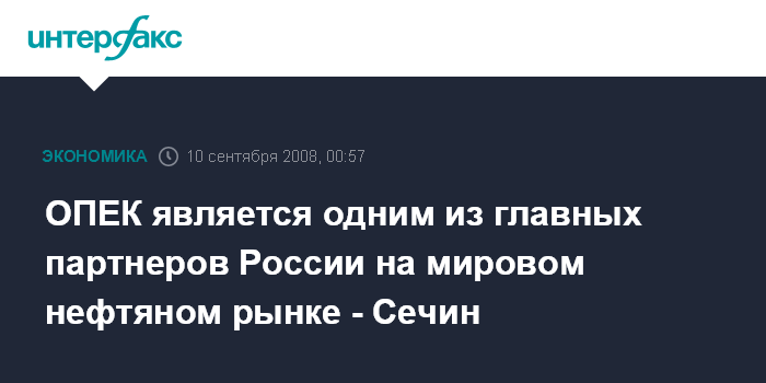 "ОПЕК - один из ключевых партнеров России на мировом нефтяном рынке. Для нас очень важно наладить механизмы регулярного энергодиалога, прежде всего в целях обеспечения глобальной энергобезопасности" - сказал И.Сечин журналистам перед началом очередной 149-ой сессии конференции ОПЕК, на которой он возглавляет российскую делегацию, присутствующую на форуме в качестве наблюдателя.