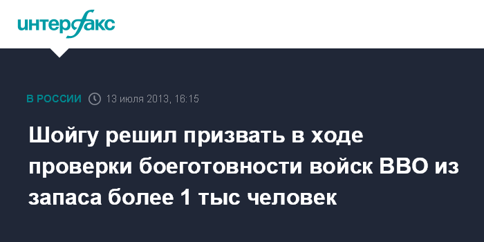 Москва. 13 июля. INTERFAX.RU - Решением министра обороны России генерала армии Сергея Шойгу в ходе внезапной проверки боевой готовности войск Восточного военного округа (ВВО) и части сил Центрального военного округа /ЦВО/ из запаса призваны более 1 тыс человек.