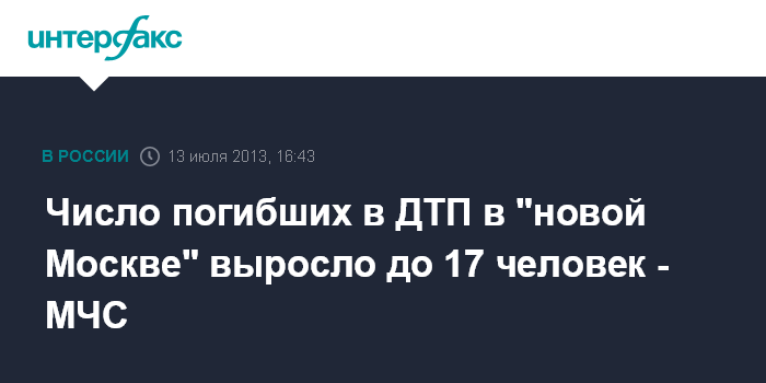 Москва. 13 июля. INTERFAX.RU - Число погибших в ДТП в "новой Москве" в субботу увеличилось до 17 человек, сообщили в МЧС. Как заявила "Интерфаксу" официальный представитель МЧС Ирина Россиус, по данным на этот час, "число погибших достигло 17 человек, так как три человек скончались в Подольской больнице".