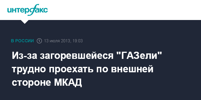 Москва. 13 июля. INTERFAX.RU - Движение на внешней стороне востока МКАД осложнено из-за загоревшейеся "ГАЗели", сообщили журналистам в пресс-службе столичного департамента транспорта и развития дорожно-транспортной инфраструктуры.