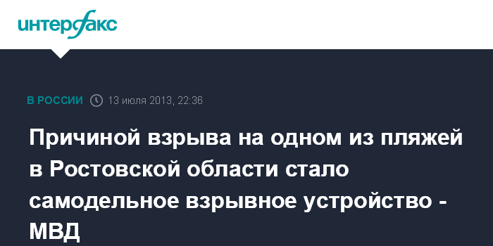 Ростов-на-Дону. 13 июля. ИНТЕРФАКС-ЮГ - Причиной неустановленного взрыва на пляже Соленого озера под Батайском (Ростовская область) стало сработавшее самодельное взрывное устройство, сообщили агентству "Интерфакс-Юг" в пресс-службе ГУ МВД РФ по Ростовской области.