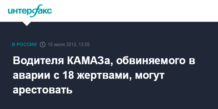 По данным полиции, в результате ДТП погибли 18 человек, еще 27 пострадали. Водитель "КАМАЗа", который находится в больнице, задержан, в понедельник ему было предъявлено обвинение по ст.264 УК РФ (нарушение ПДД, повлекшее по неосторожности смерть двух и более лиц).