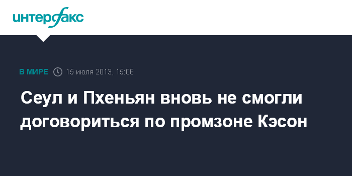 Сеул. 15 июля. INTERFAX.RU - Делегации Южной Кореи и КНДР не смогли достигнуть положительных результатов на переговорах по вопросу о возобновлении работы в совместной промзоне Кэсон, сообщили в понедельник в министерстве по делам объединения Южной Кореи.