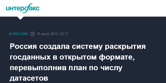 Москва. 15 июля. INTERFAX.RU - Правительство России выполнило до 15 июля, то есть в срок, поставленную в указе президента Владимира Путина задачу по созданию в стране широкой системы раскрытия информации госорганов в формате открытых данных.