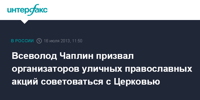 Москва. 16 июля. INTERFAX.RU - Глава синодального Отдела по взаимоотношениям Церкви и общества протоиерей Всеволод Чаплин выразил недоумение характером миссионерской акции, которая прошла на днях на Триумфальной площади Москвы, и призвал организаторов православных "перформансов" советоваться с представителями Церкви.