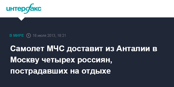 Москва. 16 июля. INTERFAX.RU - Борт МЧС России забрал из Турции на лечение в Москву четырех россиян, среди которых двое детей.