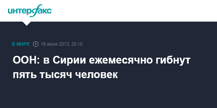 Нью-Йорк (ООН). 16 июля. INTERFAX.RU - Около 5 тыс. человек каждый месяц погибают из-за продолжающегося в Сирии конфликта, заявил во вторник помощник генсека ООН Иван Симонович.