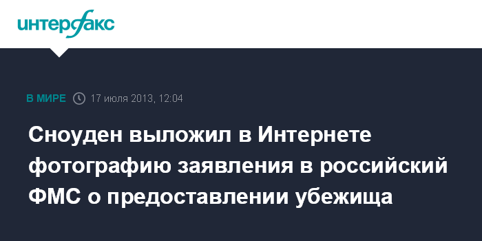 Лондон. 17 июля. INTERFAX.RU - Экс-сотрудник ЦРУ Эдвард Сноуден разместил на своей страничке в микроблоге Twitter фотографию заявления с просьбой о предоставлении ему временного убежища в РФ, направленного в ФМС.