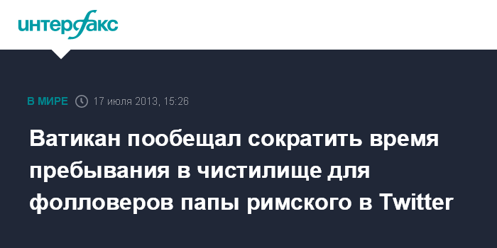 Москва. 17 июля. INTERFAX.RU - Официальный Ватикан пообещал сократить время пребывания в чистилище для всех, кто подписался на микроблог папы римского Франциска в Twitter. Об этом сообщает со ссылкой на итальянские СМИ сообщает The Guardian.