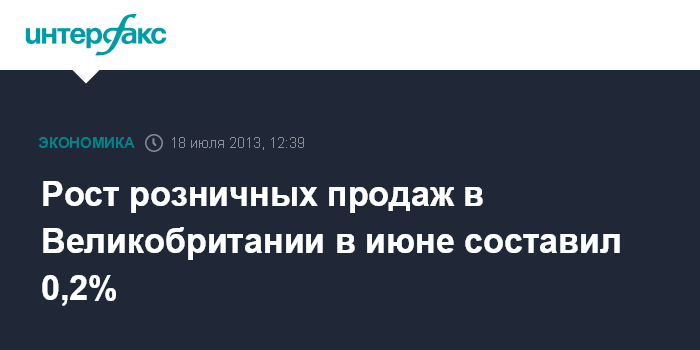 18 июля. FINMARKET.RU - В июне 2013 года объем розничных продаж в Великобритании вырос на 0,2% по сравнению с предыдущим месяцем, когда их рост составлял 2,1%, свидетельствуют данные Национального статистического управления (ONS) страны.