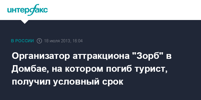 Черкесск. 18 июля. INTERFAX.RU - Карачаевский районный суд (Карачаево-Черкесия) приговорил организатора опасного аттракциона "Зорб" в Домбае, ставшего смертельным для ставропольского туриста, к четырем годам лишения свободы условно, сообщил в четверг агентству "Интерфакс-Юг" пресс-секретарь Верховного суда КЧР Алибек Боташев.
