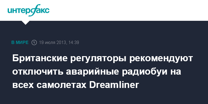 Лондон. 19 июля. INTERFAX.RU - Британские регуляторы, занимающиеся расследованием возгорания на борту принадлежащего Ethiopian Airlines самолета Boeing-787 Dreamliner на стоянке в аэропорту Хитроу в прошлую пятницу, рекомендовали временно отключить аварийные сигнальные устройства (радиобуи) всех лайнеров этой модели.