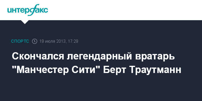 Москва. 19 июля. INTERFAX.RU - Немецкий вратарь Берт Траутманн, на протяжении практически всей карьеры защищавший ворота "Манчестер Сити", скончался в возрасте 89 лет.