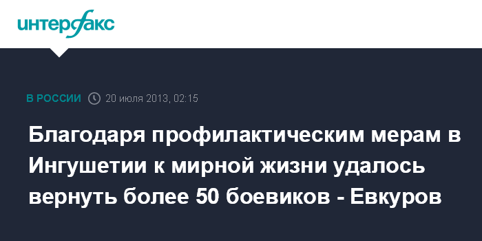 Магас. 20 июля. ИНТЕРФАКС-ЮГ - Благодаря профилактическим мерам, принимаемым правоохранителями и местными властями, в Ингушетии к мирной жизни удалось вернуть более 50 боевиков, заявил врио главы республики Юнус-Бек Евкуров на расширенной коллегии республиканской прокуратуры в пятницу.