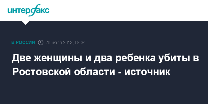 Москва. 20 июля. INTERFAX.RU - Две подруги со своими детьми убиты в Ростовской области, сообщил "Интерфаксу" источник в правоохранительных органах.