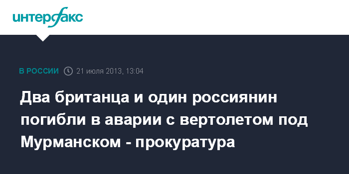 Мурманск. 21 июля. INTERFAX.RU - Под Мурманском в результате аварии с вертолетом погибли два гражданина Великобритании и один россиянин, сообщили "Интерфаксу" в пресс-службе северо-западной транспортной прокуратуры.