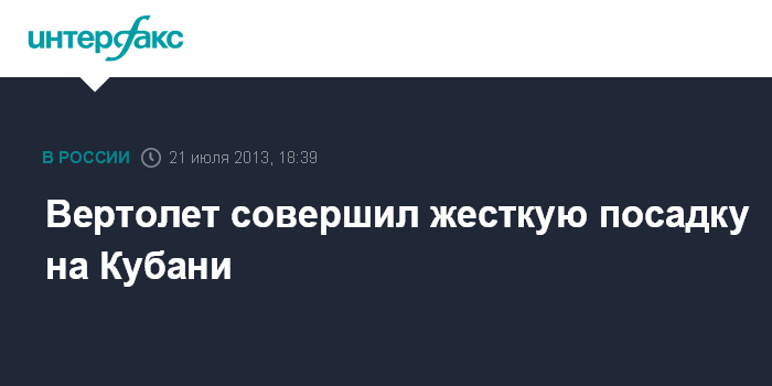 Краснодар. 21 июля. INTERFAX.RU - Принадлежащий частному лицу вертолет совершил жесткую посадку в районе поселка Солох-Аул Краснодарского края в воскресенье, сообщила агентству "Интерфакс-Юг" начальник пресс-службы ГУ МЧС РФ региона Татьяна Кобзаренко. "По предварительным данным, вертолет сел на воду, в нем находились два человека. Погибших и пострадавших, предварительно, нет", - сказала Т.Кобзаренко. Она также отметила, что инцидент случился на территории турбазы "Шале".