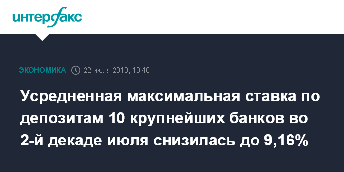 Усредненная максимальная ставка по депозитам 10 крупнейших банков во 2-й декаде июля снизилась до 9,16%