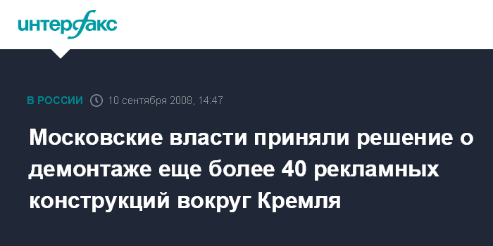 Москва. 10 сентября. INTERFAX.RU - Межведомственной комиссией при правительстве Москвы по размещению объектов наружной рекламы и информации на отдельных территориях города на последних заседаниях принято решение о демонтаже 42 рекламных конструкций в охранной зоне Кремля.