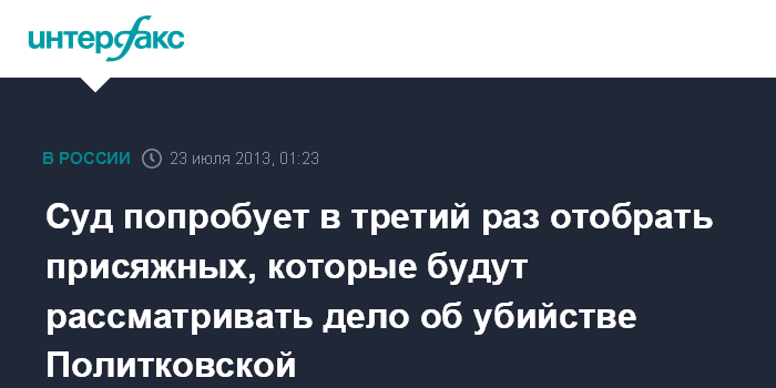 Москва. 23 июля. ИНТЕРФАКС - Мосгорсуд попробует в очередной раз отобрать коллегию присяжных, которые будут рассматривать дело об убийстве обозревателя "Новой газеты" Анны Политковской.