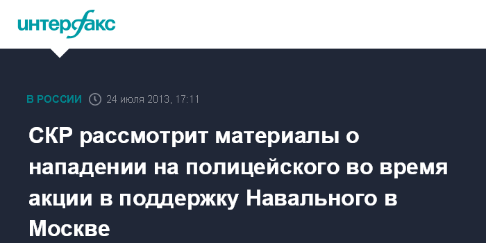 Москва. 24 июля. INTERFAX.RU - Московская полиция передала в СКР материалы по факту нападения на своего сотрудника 18 июля во время пресечения так называемого народного схода в поддержку Алексея Навального.