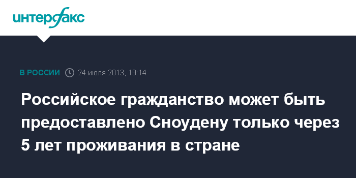 Москва.24 июля. INTERFAX.RU - Эдвард Сноуден может теоретически рассчитывать на получение российского гражданства после пяти лет легального проживания в России, заявил адвокат Анатолий Кучерена.