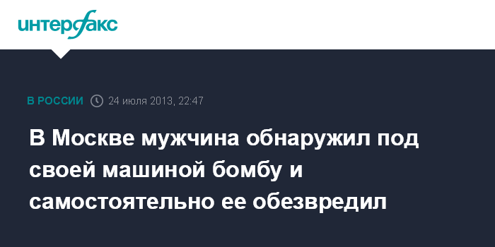 Москва. 24 июля. INTERFAX.RU - Мужчина на юге Москвы обнаружил под своим автомобилем неизвестный предмет, который оказался бомбой, сообщили "Интерфаксу" в пресс-службе ГУ МВД по Москве.