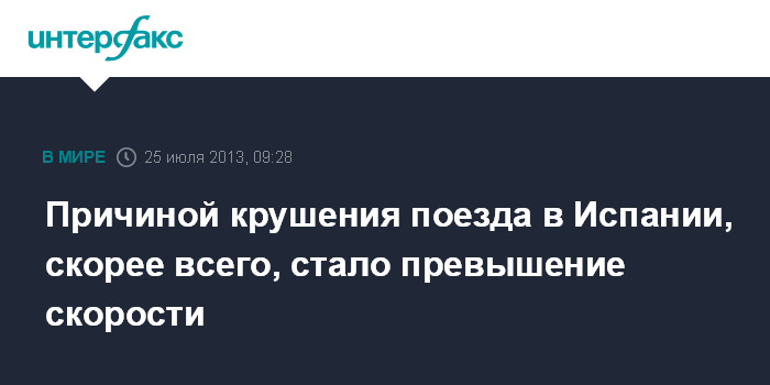 Мадрид. 25 июля. INTERFAX.RU - Наиболее вероятной причиной катастрофы пассажирского поезда в Испании эксперты называют значительное превышение скорости движения.
