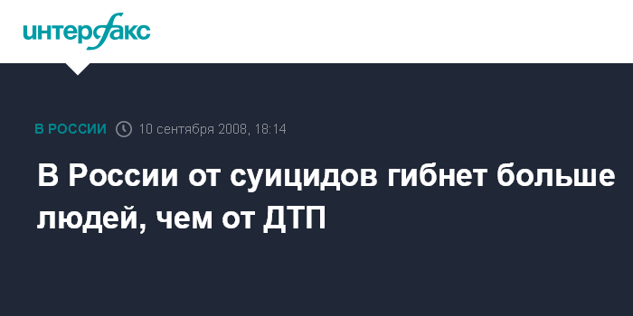 "Каждый год в России от суицидов гибнет больше людей, чем в дорожно-транспортных происшествиях. Так, в 2007 году вследствие самоубийств в стране погибли 41 тыс. 329 человек - это население небольшого города", - сообщил Б.Положий "Интерфаксу" в среду.