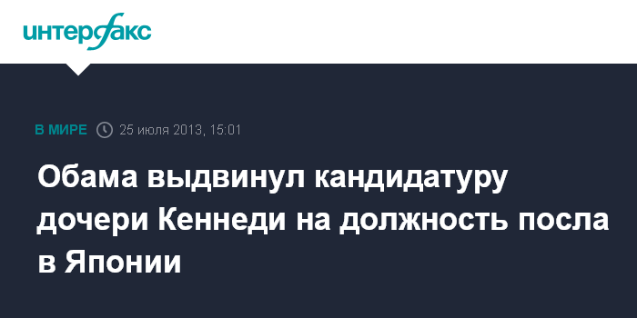 Вашингтон. 25 июля. INTERFAX.RU - Кандидатура дочери бывшего американского президента Джона Кеннеди Кэролайн внесена в список претендентов на пост посла США в Японии, сообщает в четверг Белый дом.