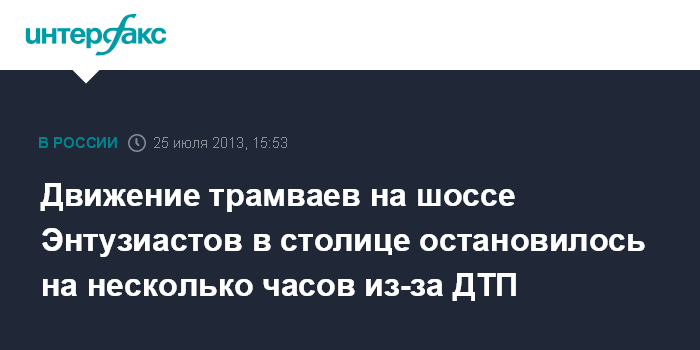 Движение трамваев по шоссе Энтузиастов до 13:50 было нарушено. "ДТП привело к нарушению движения пяти трамвайных маршрутов, работало около 10 компенсационных автобусов", - уточнил собеседник "Интерфакса".