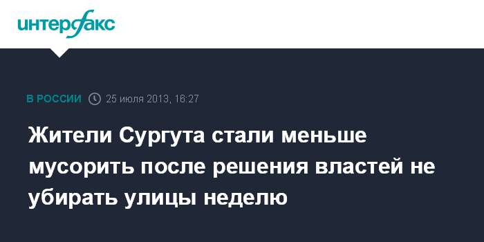Ханты-Мансийск. 25 июля. INTERFAX.RU - Подведены первые итоги акции "Какие мы, такой и город", во время которой коммунальные службы Сургута (Ханты-Мансийский автономный округ) перестали убирать улицы, сообщает администрация муниципалитета в четверг.