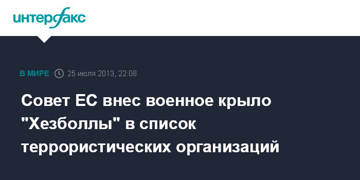 Брюссель. 25 июля. INTERFAX.RU - Совет ЕС в соответствии с постановлением от 22 июля дополнил в четверг европейский список террористических организаций внесением в него военного крыла ливанской шиитской организации "Хезболла", говорится в коммюнике, поступившем в "Интерфакс".