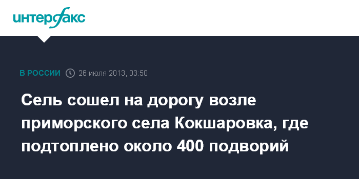 Владивосток. 26 июля. ИНТЕРФАКС - ДАЛЬНИЙ ВОСТОК - Уровень воды на территории села Кокшаровка Чугуевского района Приморья, где ливни подтопили 400 подворий, снизился на 40 см, сообщает ГУ МЧС по краю.