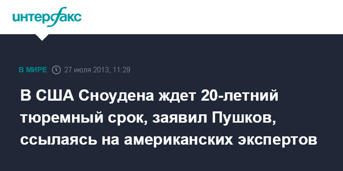 Москва. 27 июля. INTERFAX.RU - Глава международного комитета Госдумы Алексей Пушков со ссылкой на американских экспертов заявляет, что бывшему сотруднику спецслужб США Эдварду Сноудену на родине грозит 20-летнее тюремное заключение.
