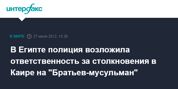Каир. 27 июля. INTERFAX.RU - Министерство внутренних дел Египта в субботу возложило ответственность за столкновения и гибель людей на протестующих сторонников свергнутого президента страны Мухаммеда Мурси. "Братья-мусульмане" отказались мирно разойтись", - заявил пресс-секретарь МВД Хани Абдельлатиф, отметив, что "полиция не использовала ничего, кроме слезоточивого газа".